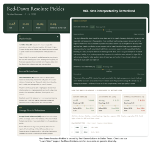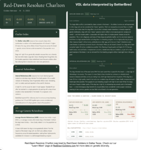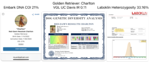 Red-Dawn Resolute Charlton a hunting bred Golden Retriever has his UC Davis VGL data interpreted by BetterBred to know details about his inbreeding