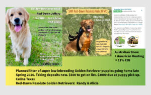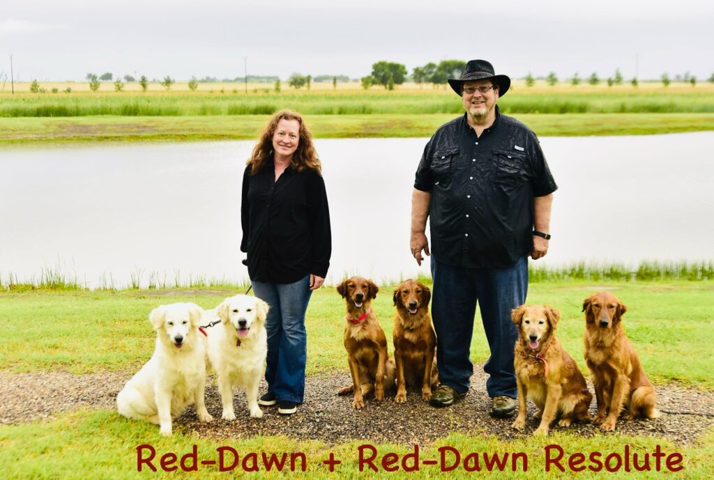 Red-Dawn Goldens is located near Dallas Texas.  Breeder, Alicia, is a professional dog trainer for pets, show and Diabetic Alert Service Dogs. Alicia has bred Goldens since the mid 1980’s. Randy has lived with and hunted Golden Retrievers for decades. Together they bring you a wealth of knowledge on Golden Retrievers