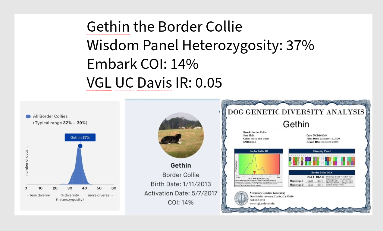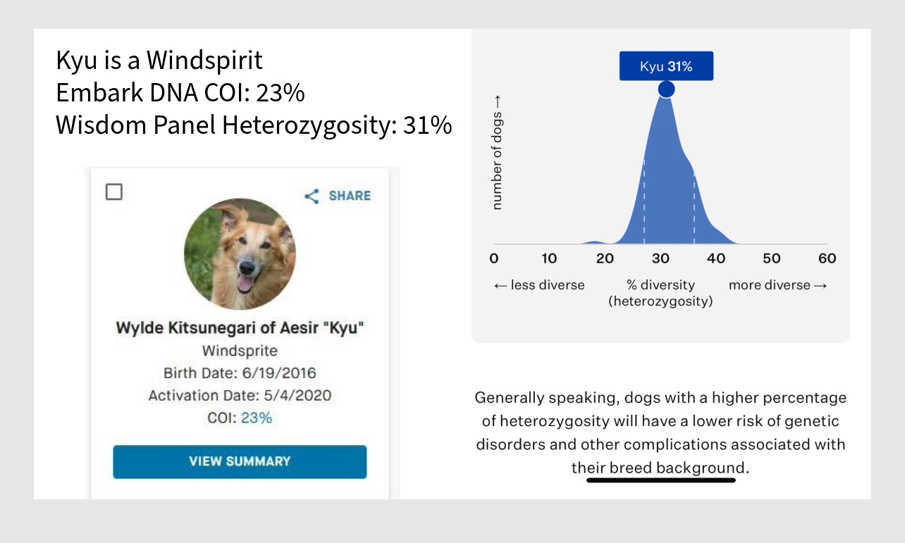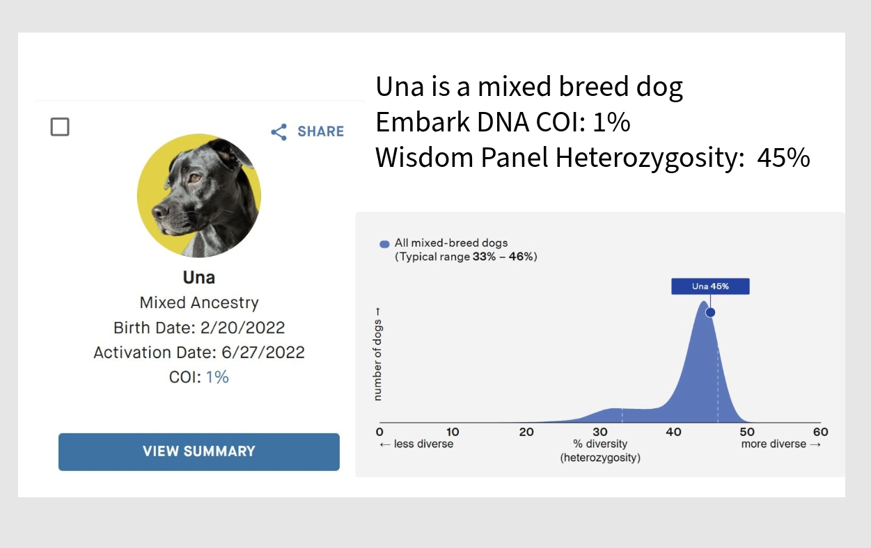 Wisdom Panel tests a dog’s genetic Heterozygosity by evaluating the DNA. A higher score is better, like in Basketball. A lower score means more inbreeding is found in that dog.