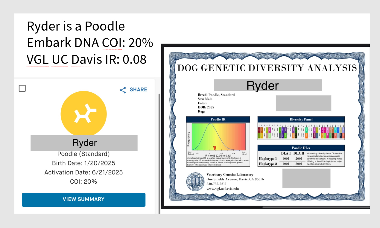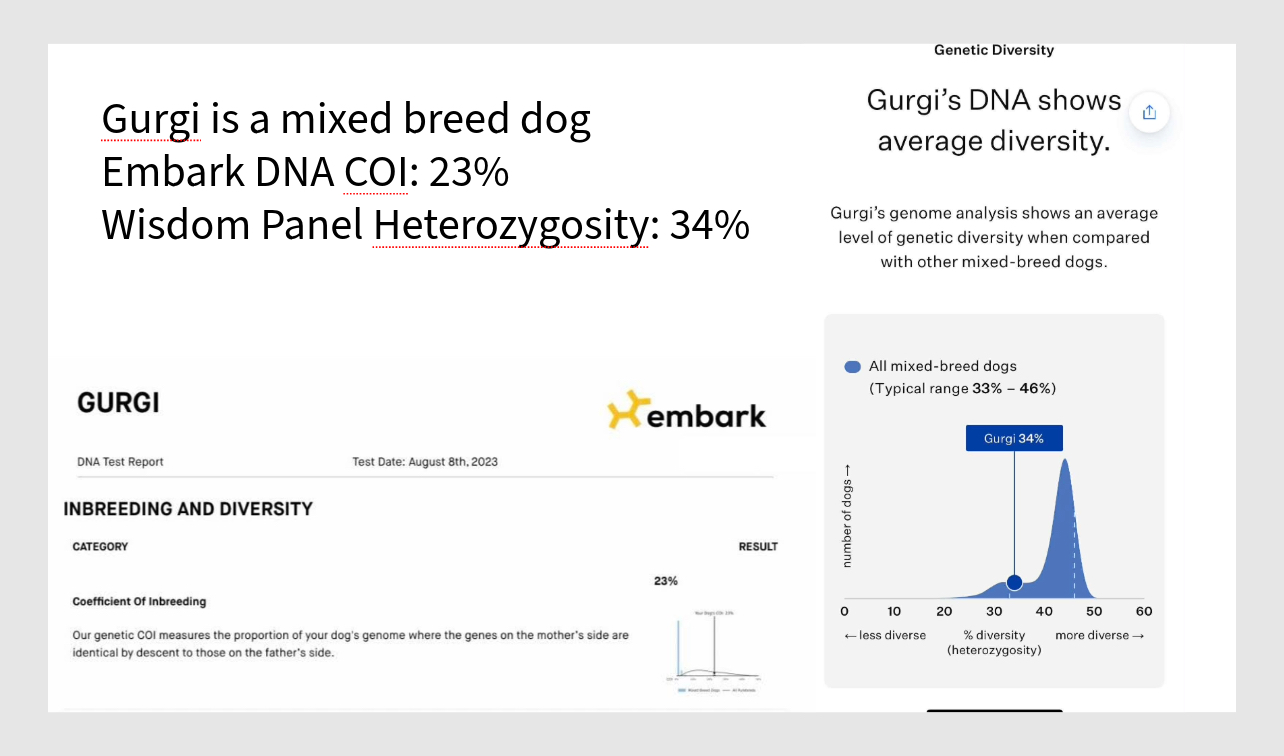 Embark DNA tests a dog’s inbreeding by looking at runs of homozygosity, called COI. A lower score is better, like in Golf. A higher score means more inbreeding is found in that dog. COI is the abbreviation for Coefficient of Inbreeding.
