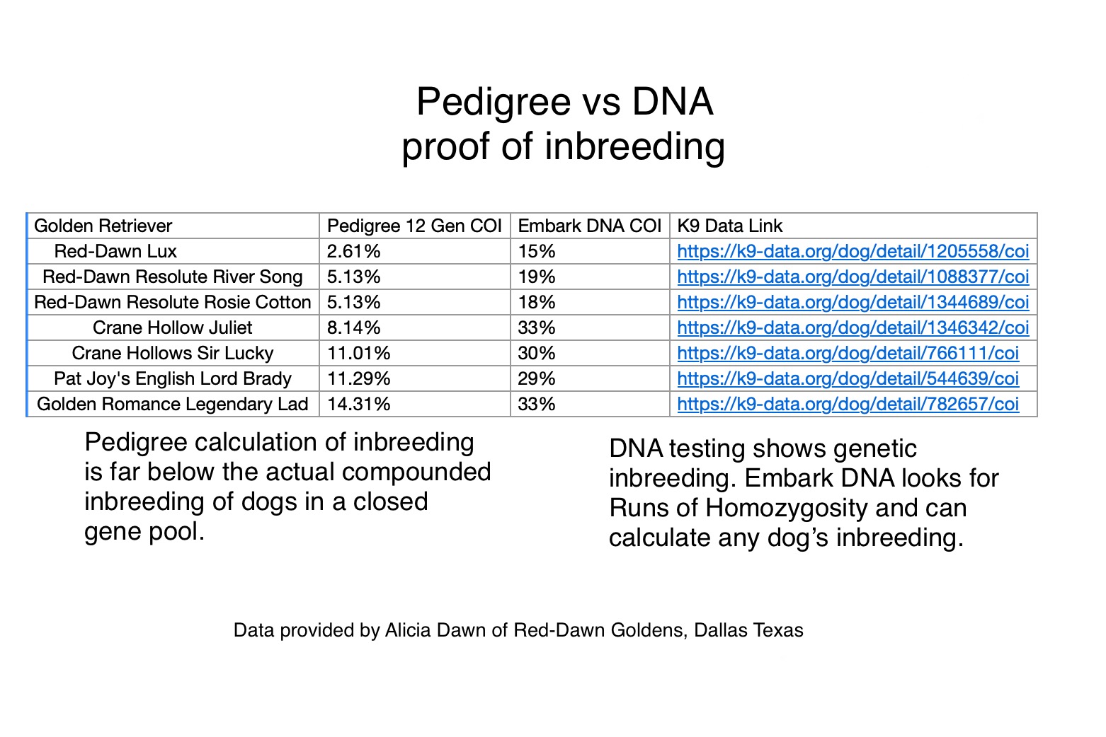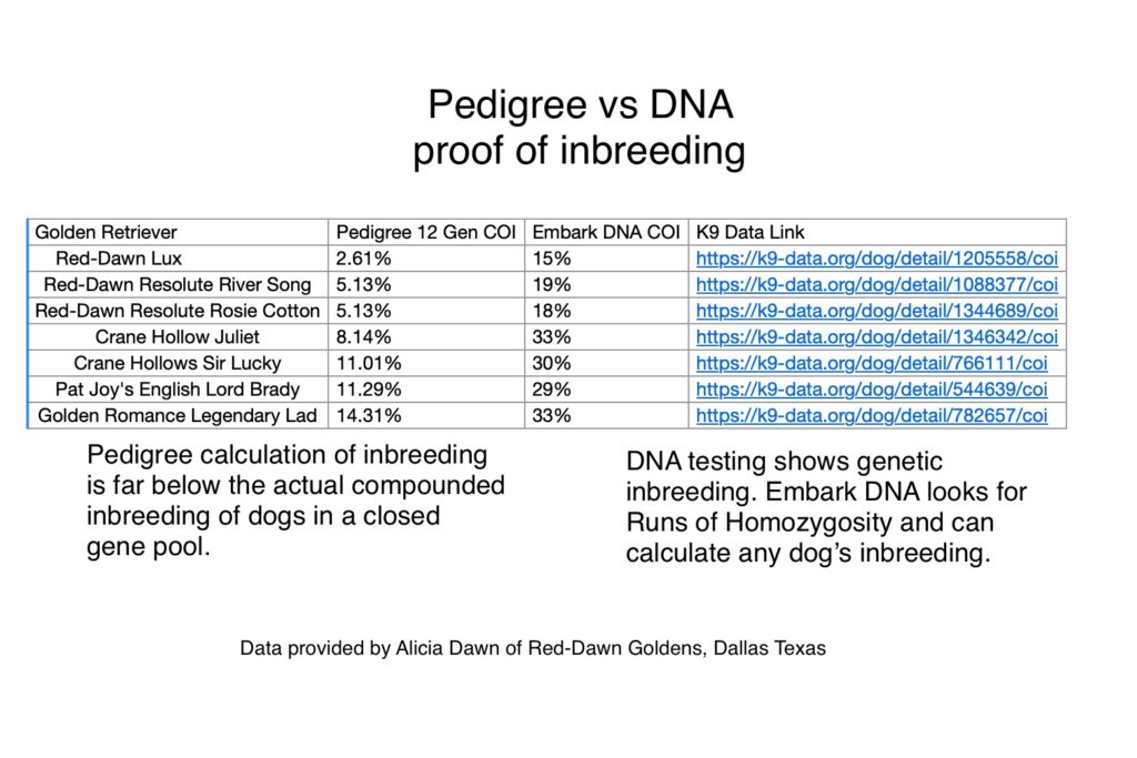 Here is an overview I did on DNA testing of Golden Retrievers vs Pedigree data. This study was not done by Embark DNA, but it shows that the science done by Embark DNA agrees with the study’s findings. Study showing DNA vs Pedigree data on Golden Retrievers.