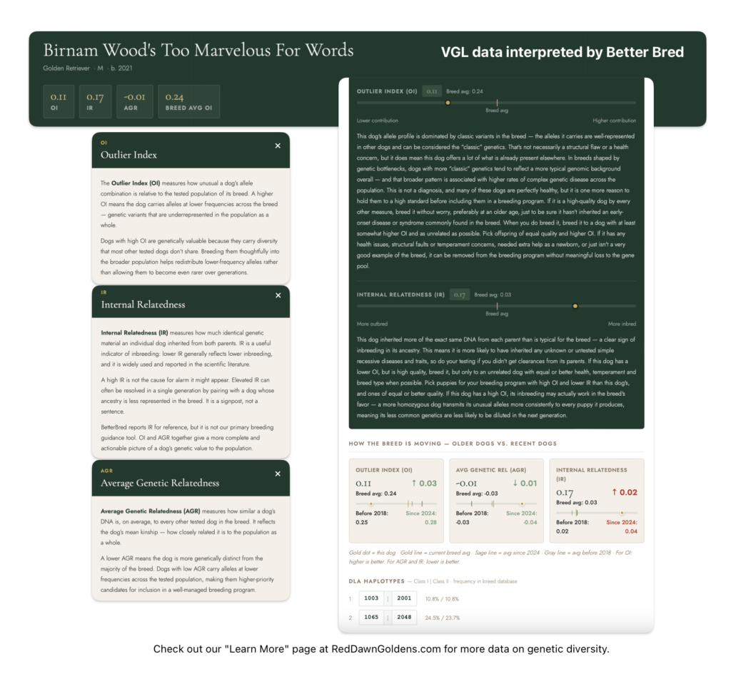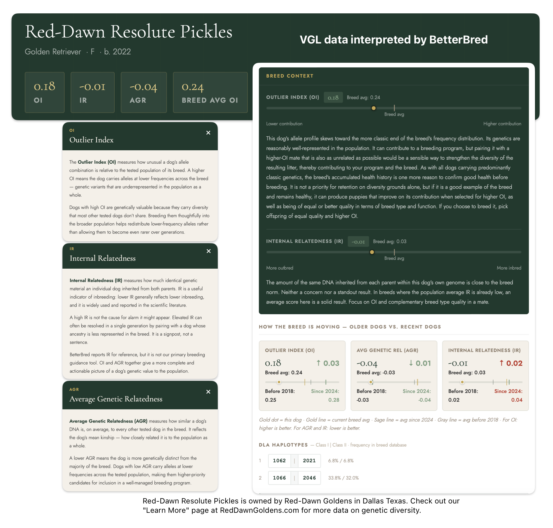 Pickles VGL, Embark, Wisdom OS Genetic Diversity results. She is a female Golden Retriever. Her Embark COI is in the yellow to green range, as is her VGL results. But her Wisdom OS says she is highly diverse. Her full sibling on this page is Charlton.