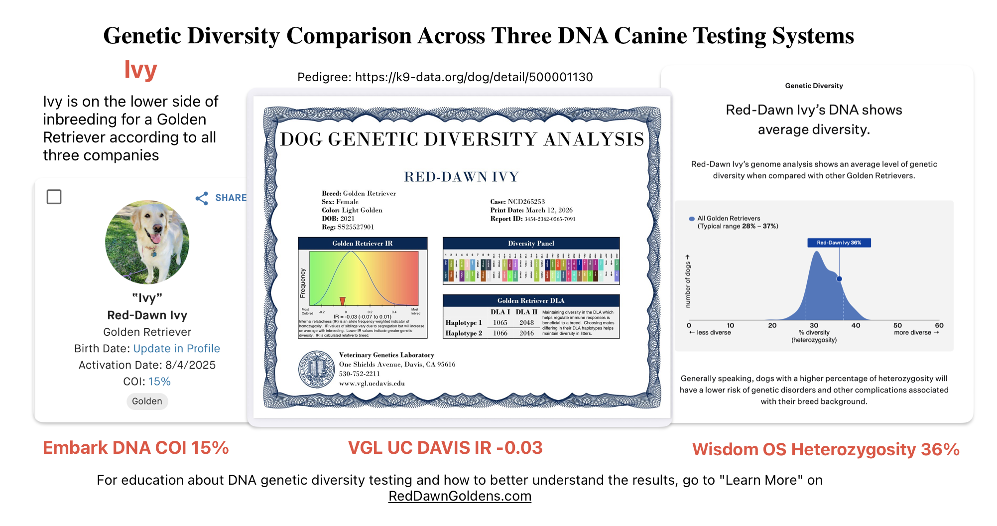 Red-Dawn Ivy a female Golden Retriever is tested at 3 DNA companies for inbreeding. She is on the lower side of inbreeding for the breed.