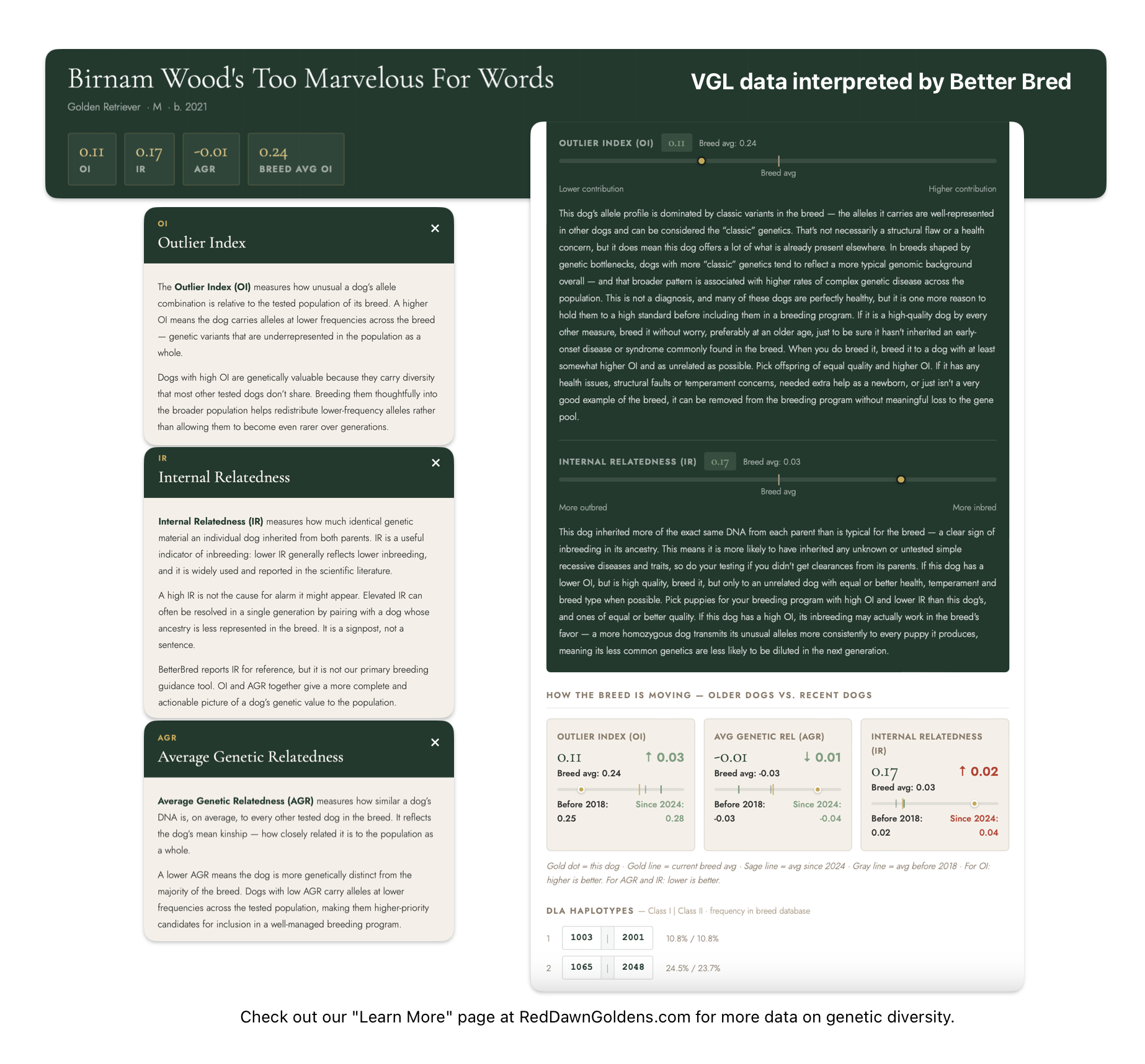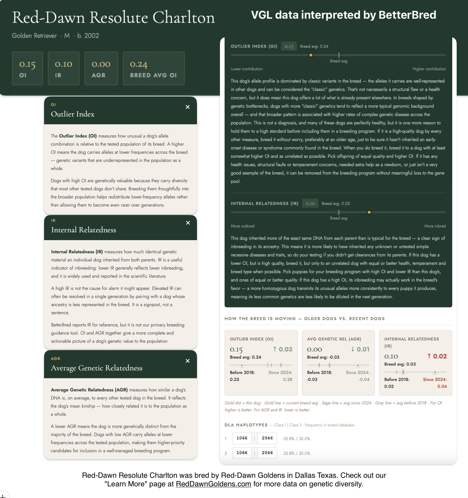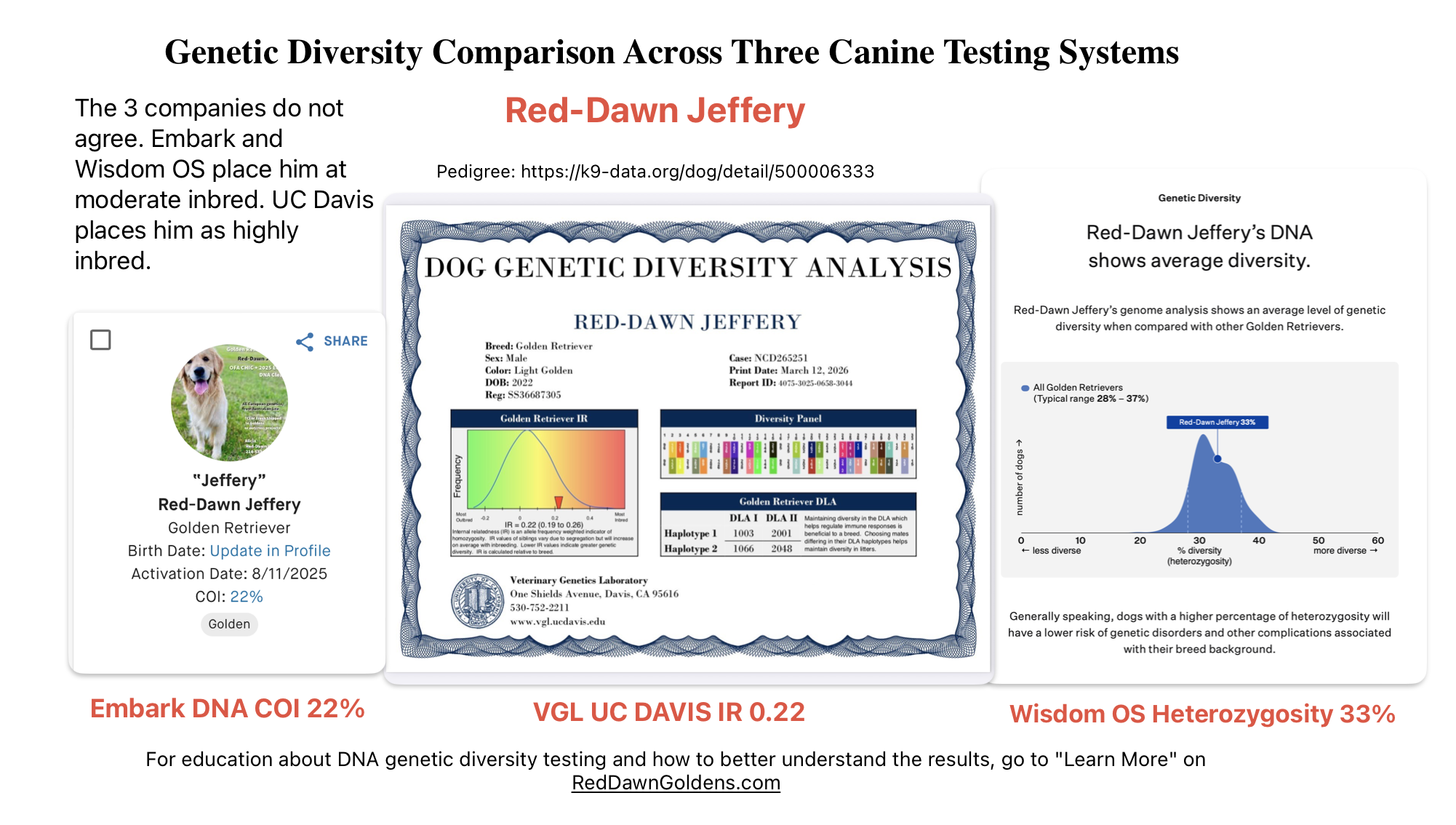 Charlton a Golden Retriever is tested at 3 DNA companies for genetic inbreeding. Embark and VGL all show he is moderately inbred. Laboklin says he is less inbred and more diverse. His full sibling on this page is Pickles.