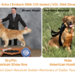 The puppies will be a medium shade of golden, just like the parents. They should have a balanced build between moderate like mom and chunky like dad. Coats can be moderate like Nala to heavy and long, more like dad. Boys traditionally carry more coat than girls.