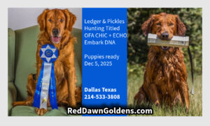 This litter of Golden Retriever puppies come from parents who are proven hunters, combining natural working ability with calm, stable temperaments that make them easy to live with. They are not hyper but instead grow into loyal companions who act as a constant shadow, always wanting to be near their people, going out of their way to please, and happily joining in games of fetch. These puppies are quick to mature, with a balanced personality that fits seamlessly into both active and relaxed lifestyles. This line is incredibly smart, perhaps smarter than some people. Their coats are lower-shedding thanks to minimal undercoat, and as they grow, their color deepens into a rich dark golden red—matching the shade of their ears as puppies, giving a preview of the stunning adults they will become. Our line of hunting genetics Goldens make outstanding duck hunters, agility competitors, service dogs and active family pets. These dogs thrive in the intense Texas summers and continues working reliably without slowing down in the heat.